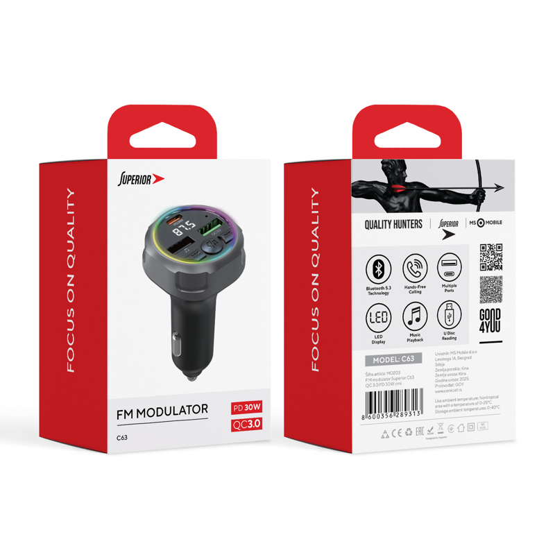 » Tehnika i mediji » Auto oprema » FM transmiteri » Proizvod: 10995-3 | FM TRANSMITTER SA PUNJAČEM ZA AUTO SUPERIOR C63 QC 3.0 PD 30W CRNI *SR NOVO+