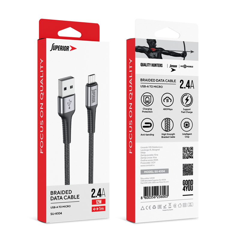 KABL USB SUPERIOR SU-K104 PLATNENI 12W 2.4A SA USB-A NA USB-MICRO 1M CRNI *SR NOVO+